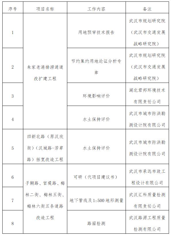 根據(jù)《武漢新區(qū)建設(shè)開發(fā)投資有限公司建設(shè)項目前期基礎(chǔ)工作社會咨詢單位遴選與管理辦法(修訂)》,新區(qū)公司評審小組對朱家老港排澇通道改擴(kuò)建工程的用地預(yù)審技術(shù)報告、節(jié)約集約用地論證分析專、環(huán)境影響評價、水土保持評價、四新北路(原漢欣街)(漢城路-芳草路)拓寬改造工程水土保持評價、子期路、官堤路、梅林二街、梅林五街、梅林六街五條道路改造工程可研(代項目建議書)、地下管線及1:500地形測量、路面檢測等專題進(jìn)行了評選,其結(jié)果詳見附表。