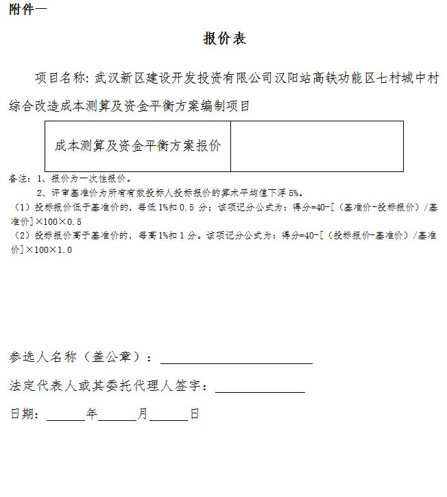 武漢新區(qū)建設(shè)開發(fā)投資有限公司正在開展?jié)h陽站高鐵功能區(qū)七村城中村綜合改造方案編制工作,根據(jù)工作安排,擬對徐灣、董家店等七村城中村綜合改造成本測算及資金平衡方案編制單位進行遴選。根據(jù)武漢市城市更新工作領(lǐng)導(dǎo)小組辦公室文件《關(guān)于印發(fā)<武漢市城中村綜合改造方案編制與審批流程>的通知》(武城更新組辦(2024)1號)要求,誠邀3家及以上具備相應(yīng)資質(zhì)的單位根據(jù)自身業(yè)務(wù)范圍自愿遞交參選文件。詳情如下: