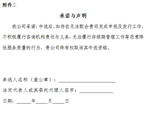 投標人應(yīng)在投標文件中承諾中選后,如存在無法配合我司完成申報及獲批工作、不積極履行責(zé)任與義務(wù),無法履行存續(xù)期管理工作等惡意降低服務(wù)質(zhì)量的行為,我公司將有權(quán)取消其中選資格。(見附件二)。