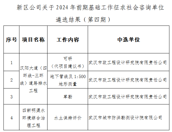 根據(jù)《武漢新區(qū)建設(shè)開(kāi)發(fā)投資有限公司建設(shè)項(xiàng)目前期基礎(chǔ)工作社會(huì)咨詢單位遴選與管理辦法(修訂)》,新區(qū)公司評(píng)審小組于2024年8月30日對(duì)漢陽(yáng)大道(四環(huán)線-三環(huán)線)道路排水工程的可研(代項(xiàng)目建議書(shū))、地下管線及1:500地形測(cè)量、草勘,四新明渠水環(huán)境綜合治理工程水土保持評(píng)價(jià)等專(zhuān)題進(jìn)行了評(píng)選,其結(jié)果詳見(jiàn)附表。