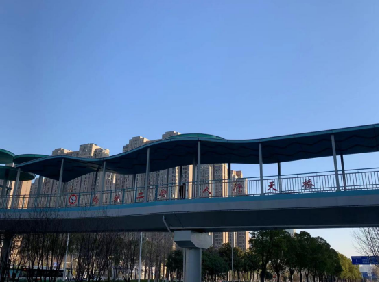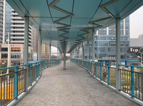 全橋總面積約1026㎡。主橋橋體為淡青色,采用三跨連續(xù)鋼箱梁結(jié)構(gòu),橫跨江城大道。橋面為灰色磚塊樣式,泛著銀色柔光,使用后會(huì)形成毛面,防滑美觀。雨棚為波浪造型,活潑大方,形態(tài)契合四新片區(qū)綠色發(fā)展主題。