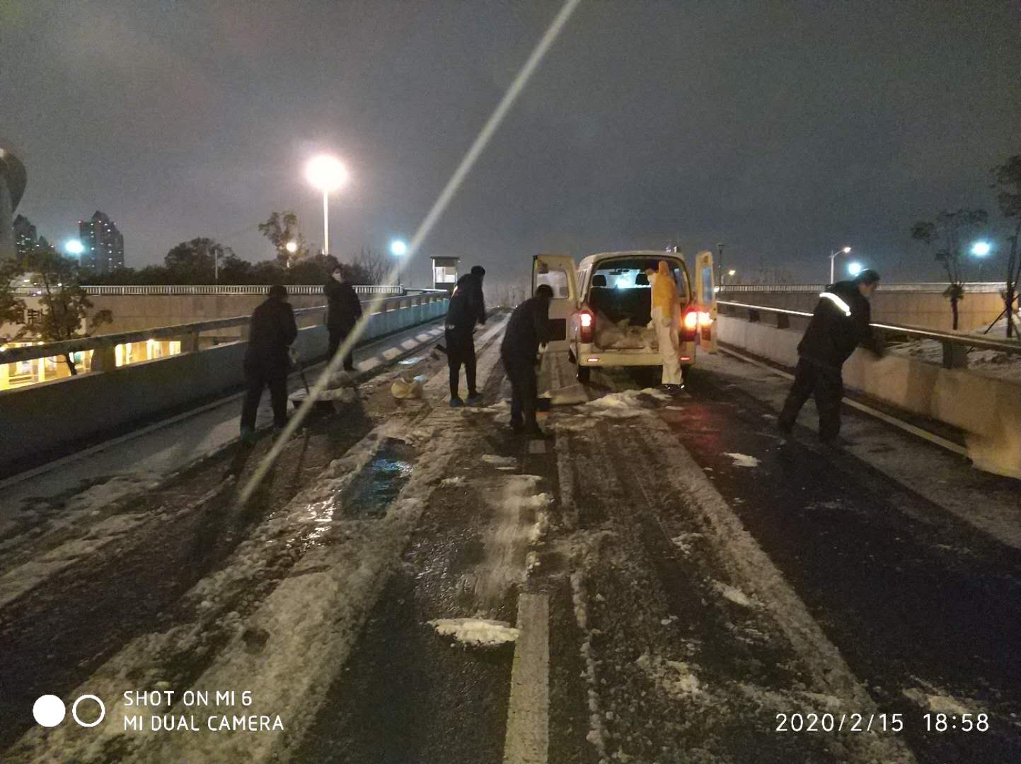 公司緊急組織施工單位、下屬單位人員30余人、貨用車5臺(tái),儲(chǔ)備融雪劑15噸,準(zhǔn)備應(yīng)急除雪。下午17:00左右,公司出動(dòng)車輛4臺(tái),對(duì)江城大道四新南、北路通道及三青路下穿通道,四新南、北路跨國博大道立交等重點(diǎn)部位預(yù)撒融雪劑,19時(shí)許,按照集團(tuán)公司應(yīng)急辦指示赴國博洲際酒店上下匝道處撒融雪劑,確保軍醫(yī)醫(yī)療進(jìn)出通道通暢。